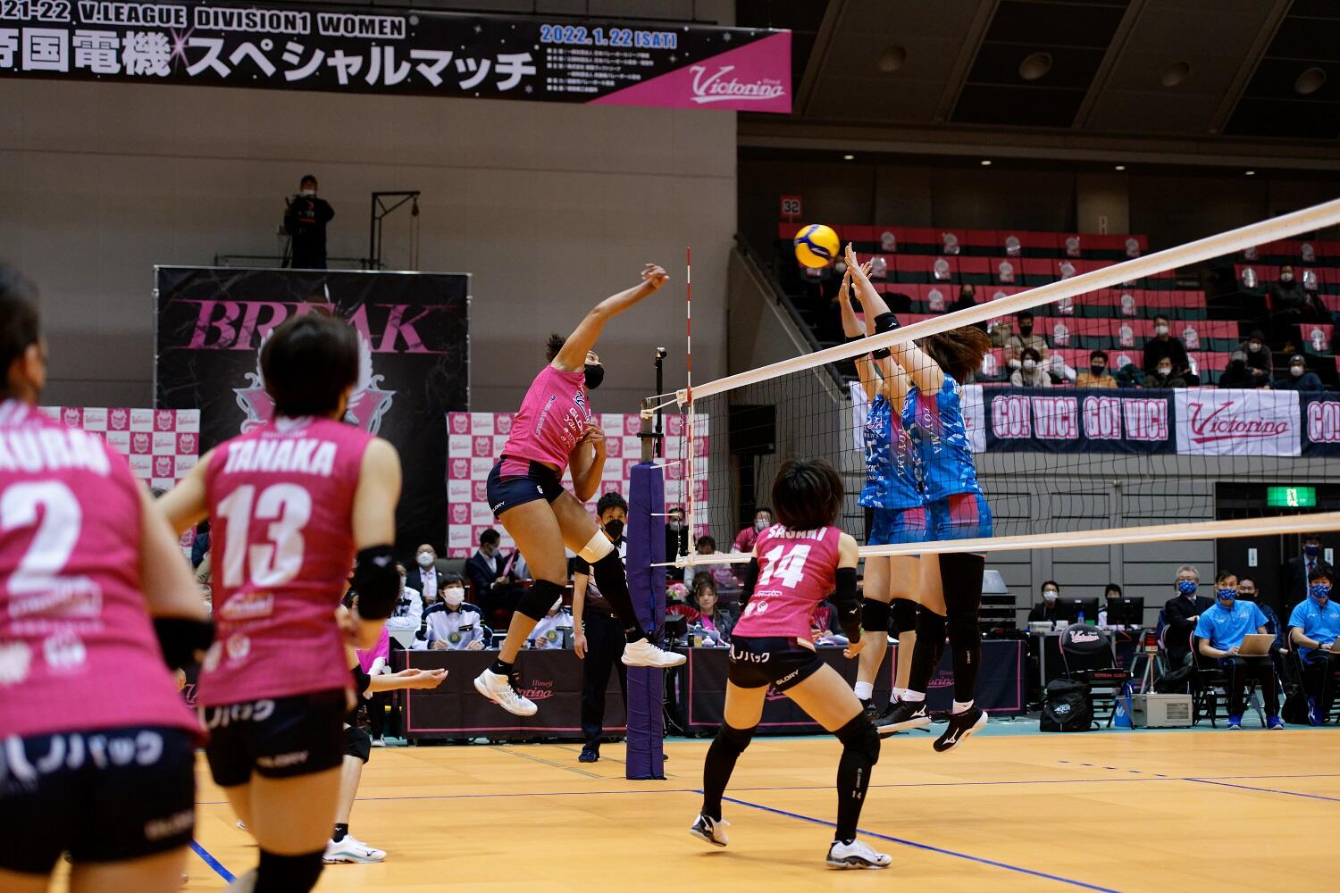 当日の対戦相手は「JTマーヴェラス」でしたが、まず2セットを連取したあと、第3セットは落としてしまったものの、ヴィクトリーナの粘り強さと地元サポーターの熱い応援も一段と加わり、第4セットを見事奪って3-1での鮮やかな勝利となりました。