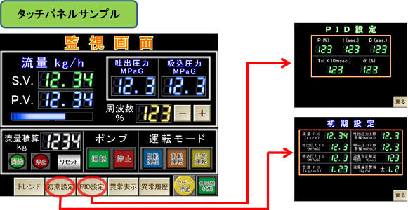 制御盤は、定量ポンプのコントロールだけでなく、他のプロセスのコントロールも含めて製作いたします。また、タッチパネルを装備することでより簡単に、自由自在のコントロール、警報出力が可能となります。このように多彩なバリエーションにより貴社の御仕様に合わせて弊社で最適なコントロールシステムを構築いたします。